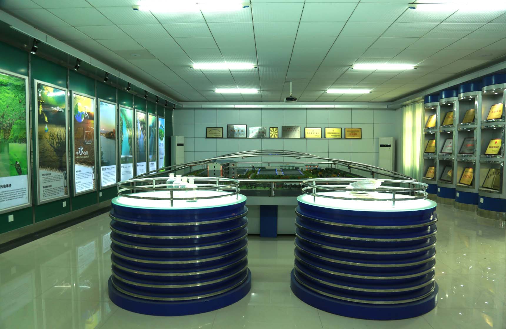 展览厅分为四个部分,一是水环境保护的宣传,二是平面布置实体模型,三是公司党委历年获得的部分荣誉展示,四是进出水样。